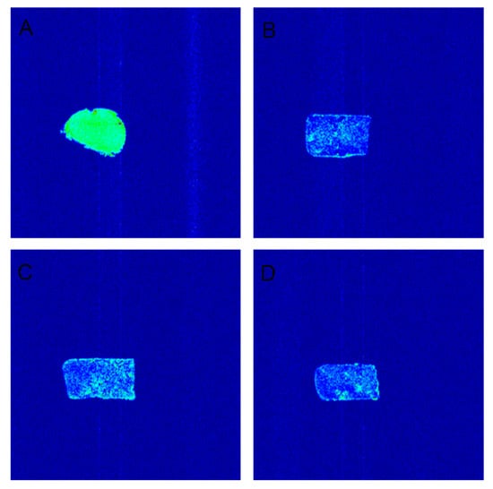 Pseudo color map of different tofu types. (A) Commercially available lactone tofu. (B) Lactone tofu with 5% cellulose. (C) Lactone tofu with 10% cellulose. (D) Lactone tofu with 15% cellulose.