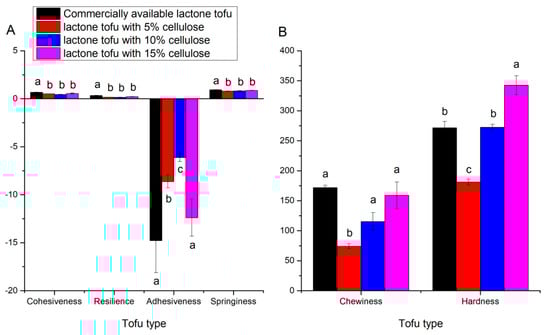 During TPA analysis, the absolute peak force on the first downstroke was used to determine hardness [], and the addition of soybean residue fiber to tofu increased the tofu product’s solid content; adding addition of 10% soybean residue fiber had the same hardness as that of commercial lactone tofu (p > 0.05) []. Cruz et al. (2009) mentioned that the large fat droplets in soy-yogurt gel disrupt the network homogeneity and decrease the gel’s firmness, whereas adding cellulose can strengthen the hardness of tofu []. Moreover, the chewiness of tofu indicates how easy it is to swallow. In this study, tofu with different amounts of bean fiber addition had the same chewiness as commercially available lactone tofu (p > 0.05), except for the 5% addition. Adhesiveness is the energy required to break up the attractive forces between the surface of the food and the surfaces of other materials. Figure 4A depicted that only lactone tofu with 15% cellulose had similar adhesiveness to that of the commercially available lactone tofu. Lactone tofu with cellulose contains a large amount of cellulose and soybean polysaccharides, which weakened the interaction between proteins, resulting in a loose network structure of the gel and a reduction in texture indices []. In brief, the lactone tofu samples with 10% cellulose and 15% cellulose both had certain market competitiveness in ensuring the quality of tofu.