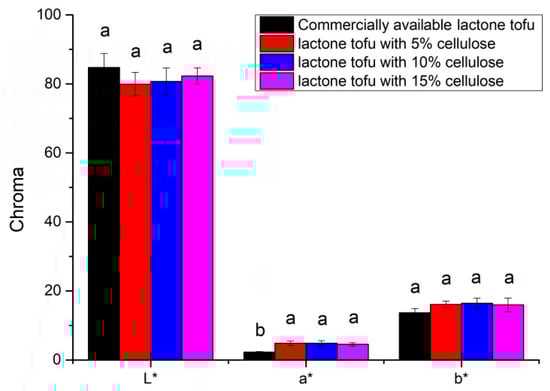 This method was slightly modified from Kim’s color measurement []. The color of tofu was determined based on CIE using a colorimeter (UltraScan Pro, HunterLab, Reston, VA, USA). Each sample was taken from three different parts and averaged. Before the sample was analyzed, the standard whiteboard was used to correct the color difference meter to determine the sample b* (yellowness value; a positive number represents yellow, and a negative number represents blue), a* value (redness value of reaction sample; a positive number represents red, a negative number represents green), L* (luminance value, brightness of reaction color).