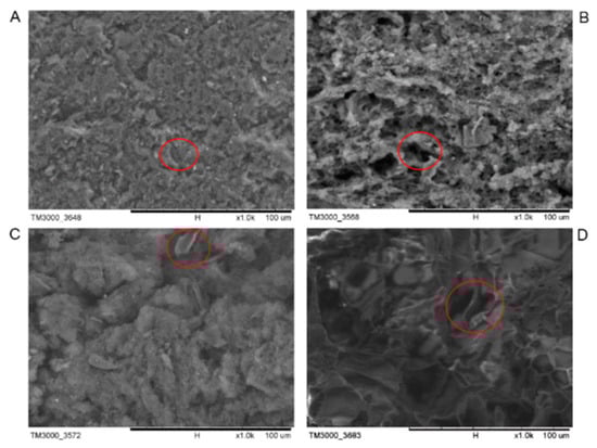 Scanning electron micrographs of tofu made with different additions of soybean fiber and commercially available lactone tofu at 1000× magnification. (A) Commercially available lactone tofu. (B) Lactone tofu with 5% cellulose. (C) Lactone tofu with 10% cellulose. (D) Lactone tofu with 15% cellulose. The circles represent cellulose fragments and pores.
