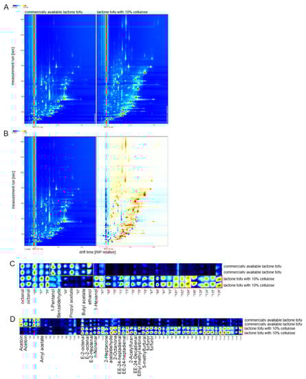 Combining the results of all the previous experiments, the cellulose addition of 10% was finally selected for judging the aroma differences between the final products and the commercially available lactone tofu. As can be seen from the comparison chart above (Figure 7A,B), the volatile organic compounds in the two kinds of tofu were significantly different. In order to compare the differences between the different samples clearly, a difference comparison mode was employed in the study: The spectrum of commercially available lactone tofu was selected as a reference, and the spectrum of the lactone tofu with 10% cellulose was deducted from the reference. If the volatile organic compounds were the same, the deducted background was white, while red indicated that the concentration of the substance was higher than the reference, and blue indicated that the concentration of the substance was lower than the reference [].