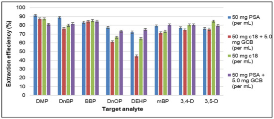 The optimization of the QuEChERS cleanup was achieved by calculating the extraction efficiency, as described in Section 2.6.3, using different types and amounts of sorbents, namely PSA, GCB, and C18, or sorbent combinations. Comparison of the extraction efficiency of the applied QuEChERS cleanup protocols is illustrated in Figure 2. The addition of salt, and especially MgSO4, ensures the absorption of H2O residues that might hydrolyze the esters [36], which might increase extraction efficiency via an increase in the ionic strength of the solutions [43]. Moreover, a procedural blank was performed to assess the cross-contamination from glassware, where no amounts of phthalates nor dichloroanilines were identified.