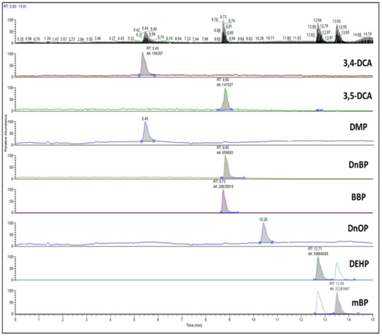 Based on the obtained results, application of PSA alone was the most efficient, having the highest mass fractions of all analytes. In the case of C18 sorbent (50 mg per mL), a decrease in the isobars DEHP and DnOP was observed, with the efficiency being less than 60% for both analytes. The combination of C18-GCB (50 mg + 5.0 mg per mL) had an even more pronounced effect on these isobars, reducing their extraction efficiency to 55% and 35%, respectively, indicating a strong binding effect between the analytes and the sorbent material. Fifty milligrams of PSA-GCB (50 mg + 5.0 mg per mL) proved to, also, be efficient, presenting the same effect for both DEHP and DnOP, though with higher extraction efficiency (65% and 64%, respectively). Thus, it could be concluded that the best cleanup approach has been achieved by using only PSA at a level of 50 mg per mL extract, as the extraction efficiency was calculated to be above 72% for all target analytes. PSA was selected as the optimum sample preparation protocol. The use and the extraction efficiency of PSA, in the case of phthalates, was, also, reported in different food matrices, as in tea by Yadav et al. [44], in mussels [23], and in various food samples by Cao et al. [45], where ethyl acetate or acetonitrile were preferred as extraction solvents. The chromatograms of spiked rice grain samples, extracted with the validated QuEChERS cleanup protocol, are presented in Figure 3.