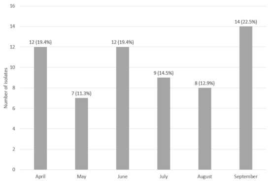 Number and percentage (%) of the total number of obtained isolates (62–100%) of L. monocytogenes according to months of sampling.
