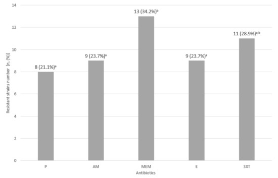 Resistance of 38 isolates of L. monocytogenes to antibiotics (P—penicillin; AM—ampicillin; MEM—meropenem; E—erythromycin; SXT—cotrimoxazole; a,b—values marked with different letters differ in a statistically significant way (p ≤ 0.05). In brackets, the percentage of resistant isolates is given. The limited number of isolates is a result of the exclusion of genetically identical isolates.