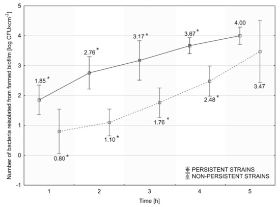 Assessment of the rate of initiation of biofilm formation for the persistent and nonpersistent L. monocytogenes strains. The horizontal shift of points relative to the timeline is only used to maintain the chart’s readability. The starting density at the 0 h timepoint was 0.5 McF for each strain. *—values assigned to the same time point, marked with an asterisk, differ statistically significantly (p ≤ 0.05).