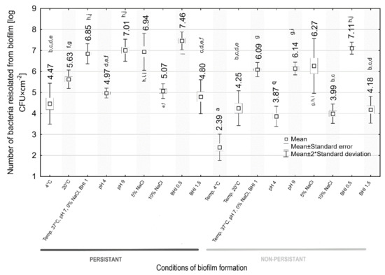 The effect of environmental conditions on biofilm formation by both persistent and sporadic L. monocytogenes strains was shown (Figure 5). We observed statistically significant differences in the number of L. monocytogenes recovered from biofilm between the persistent and sporadic strains (6.85 vs. 6.09 log CFU × cm−2) under the control conditions (37 °C, pH 7, 0% NaCl, 1 BHI) (Figure 5).