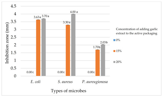 According to Pan et al., the response to bacterial growth inhibition was divided into three categories: antibacterial activity with zones of inhibition greater than 6.00 mm (strong), 3–5 mm (moderate), and less than 3 mm (weak) [50]. Figure 2 provides information that shows active packaging with no addition of garlic extract had no inhibitory activity to all bacteria tested. While the addition of 15% and 20% of garlic extract to the active packaging showed a moderate response against E. coli (3.6 mm and 3.3 mm, respectively) and also moderate against S. aureus (3.7 mm and 4 mm, respectively). While for P. aeruginosa the active packaging categorized has a weak inhibitory response both in the administration of 15% and 20% garlic extract with 1.7 mm and 2 mm, respectively.