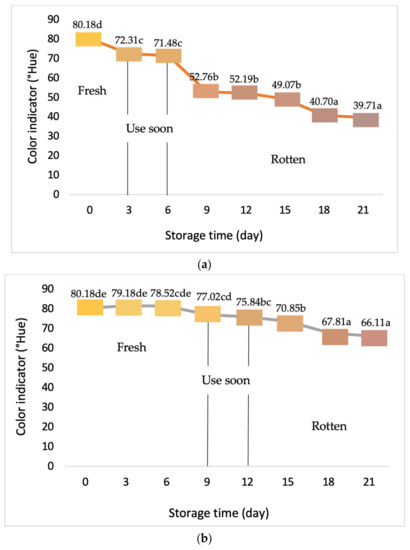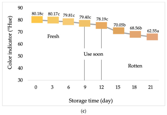 Figure 3 showed that the oHue value on the intelligent indicator label decreased during storage, from dark yellow to faded red. The color change is a response to the quality condition. There are three phases of change on intelligent packaging labels in the description.