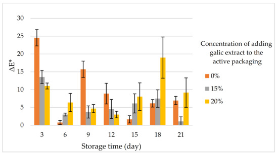 Delta E is a standard measurement for quantifying the difference between two colors. The standard delta E perception consists of five scales: 1.0 is invisible to the human eye; 1–2 visible through observation; 2–10 at a glance; 11–49 colors are more similar than opposite; and 100 colors are opposite [55]. Based on Figure 4, the smart indicator shows the value of delta E with a range of 1–18 for each treatment, except on storage days 3–6, the value of delta E is 0.77. This shows that smart indicators are generally easy to visualize based on color changes in smart packaging systems. Based on this, consumers will easily make visual assessments and also monitor the freshness of the meat through intelligent packaging sensors.