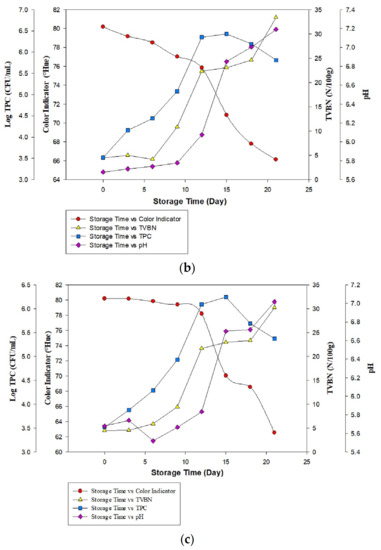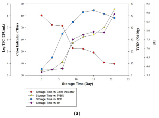 The color change on the intelligent indicator label is closely related to the increased number of microbes and enzymes in meat during storage. These changes are caused by the decomposition of nutritional components of meat by enzymes and microbes, producing volatile base compounds used as an early sign of damage in packaged beef. This is consistent with Sani et al. Who showed that volatile ammonia compounds in meat can increase the pH [54]. The increase in the pH of meat is caused by ammonia reacting with H+ ions to produce H ions. The OH- ions in the packaging are directly proportional to the pH value, affecting the change in intelligent indicator labels.