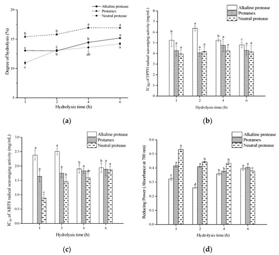 The DH and antioxidant activity of different hydrolysates under different hydrolysis times. (a) DH; (b) IC50 of the hydrolysates for DPPH radical scavenging; (c) IC50 of the hydrolysates for ABTS radical scavenging; (d) Reducing power of the hydrolysates at 8 mg/mL. Different letters on the top of the same pattern (point or column) indicate the significant difference between the hydrolysates obtained by the same protease at different hydrolysis times (p < 0.05).