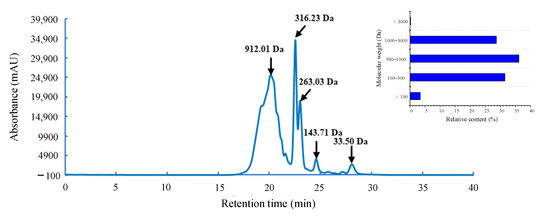 Molecular weight distribution of G. livida protein hydrolysate prepared by neutral protease for 1 h hydrolysis.