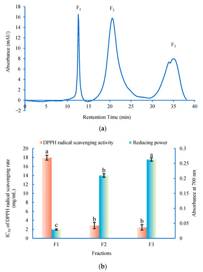 Separation of G. livida hydrolysate by semi-preparative RP-HPLC and the antioxidant activities of the peptide fractions. (a) Semi-preparative RP-HPLC; (b) The reducing power (at 4 mg/mL) and the IC50 of DPPH radical scavenging rate of the fractions. Different letters on the top of the same pattern column indicate the significant difference between the fractions in the same test (p < 0.05).
