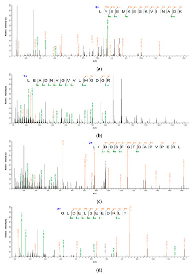 Secondary mass spectrum of antioxidant peptides from G. livida. (a) LYEEMKESKVINA DK; (b) LEADNVGVVLMGDGR; (c) LIDDSFGTDAPVPERL; (d) GLDELSEEDRLT.