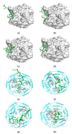 Molecular docking results of LYEEMKESKVINADK (a,e), LEADNVGVVLMGDGR (b,f), LIDDSFGTDAPVPERL (c,g), GLDELSEEDRLT (d,h). (a–d) reflect the surface docking simulations between the peptides and Keap1, and (e–h) reflect the peptides binding with amino acid residues in the Keap1 activity center.