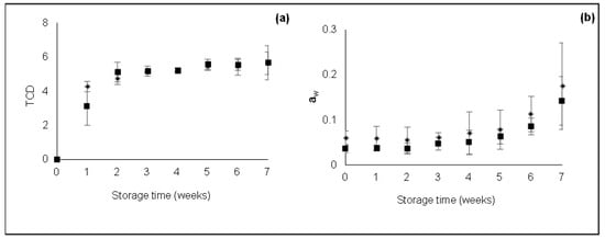 TCD (a) and aw (b) of non-ozonized (◆) and ozonized (■) dried peels during storage. Data represent mean values and bars represent the limits of confidence intervals at 95%.