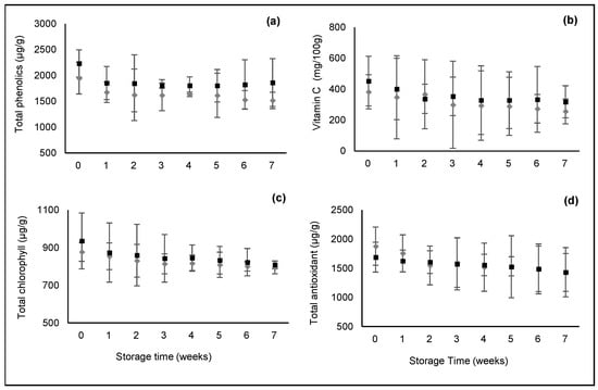 Total phenolic content (a) vitamin C, (b) total chlorophylls content and (c) total antioxidant activity (d) in non-ozonized (◆) and ozonized (■) dried peel. Data represent mean values and bars represent the limits of confidence intervals at 95%.