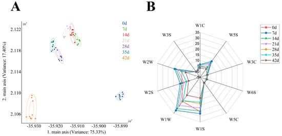 Figure 1. LDA analysis chart (A) and radar chart (B) of aroma at different times using the E-nose test.