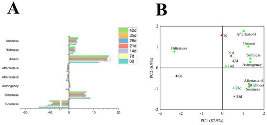 Figure 2. Taste value (A) and PCA analysis (B) of E- tongue at different fermentation times. PCA is expressed as the mean of flavor values.