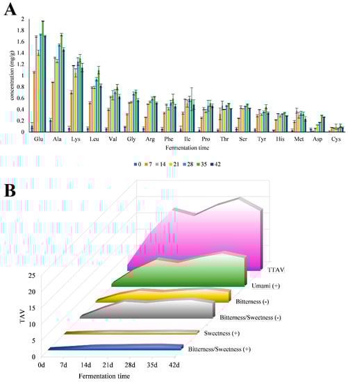Figure 3. Concentrations of 17 FAA (A) and taste activity value (TAV) of various taste amino acids and total TAV (TTAV) at different times (B).