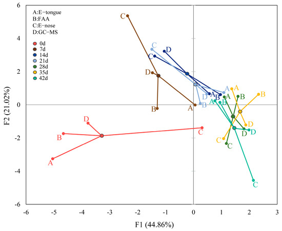 MFA can be used to study relationships by simultaneously analyzing the observations, variables, and tables [51]. In this study, MFA was performed to analyze the relationship among five factors: E-nose, E-tongue, FAA, GC-MS, and fermentation time. After the analysis data were processed by dimensionality reduction, the first two factors had 65.88% (F1 and F2: 65.88%) of the variability. As shown in Figure 4, the points of each sample were projected onto the plane, and their observations were connected. The farther the observation point from the center, the better the observation point properties of the sample could distinguish it. Figure 4 shows that the E-nose aroma value of fermented pork loin ham with different fermentation time might be the key factor in distinguishing fermented pork loin ham with different fermentation times.