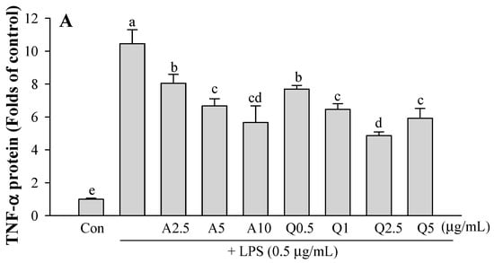 Microglial cells were treated with various doses of Ast (2.5–10.0 μg/mL) or Que (2.5, 5 μg/mL) and 0.5 μg/mL LPS for 12 h. Ast and Que strongly inhibited LPS-induced NO dose-dependent, up to 10 μg/mL Ast or 5 μg/mL Que (Figure 3B).