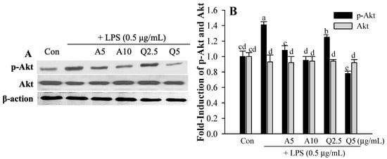 Effect of Ast (or A) and Que (or Q) on LPS-induced phosphorylation of Akt (A,B) and MAPKs (p38, Erk, and JNK; (C–F)) pathways in microglia. Con, control: LPS- and sample-untreated cells; Group LPS: cell treated with LPS only. The density of each protein band was quantified by using SigmaGel software. The values shown are the mean ± SD (n = 3) and means with different letters (a–e) within a property differ significantly as shown by Duncan’s multiple range test (p < 0.05). Akt, protein kinase B; Erk, extracellular protein regulated protein kinase; JNK, c-Jun N-terminal kinase; MAPKs, mitogen-activated protein kinases.