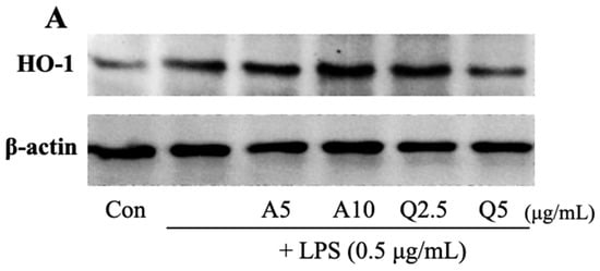 HO-1 is a stress-induced antioxidant enzyme with potential anti-inflammatory effects [37]. Hence, we examined the influences of Ast and Que on HO-1 induction. Western blot analysis revealed dramatically increased OH-1 expression after simultaneous Ast (10 μg/mL) and LPS (0.5 μg/mL) treatment compared to LPS treatment (Figure 8). Therefore, it is indicated that Ast up-regulates HO-1. In the same experiment, when microglia were co-treated with Que (2.5 μg/mL) and LPS, a statistically significant increase in HO-1 protein was observed compared to cells treated with LPS. However, the stimulatory effect of LPS on the HO-1 protein level was inhibited by adding 5 μg/mL Que.