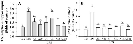 The experimental setup is shown by the treatment scheme (Figure 9A). Hippocampal TNF-α, IL-1β and IL-6 protein levels and blood TNF-α protein levels were significantly increased in the LPS-treated mouse group compared to the control group. The mRNA levels of TNF-α and COX-2 were significantly increased in the hippocampus obtained from LPS-induced mice (Figure 9F,G). Levels of cytokines, such as TNF-α, IL-1β, and IL-6, in the hippocampus were significantly decreased in Ast (or A) and Que (or Q) treated mice compared to those observed in LPS-treated mice (LPS group) (Figure 9B,D,E). In addition, the level of TNF-α in the blood was significantly decreased in the Ast or Que treatment group compared to the LPS treatment group (Figure 9C). The administration of Ast and Que significantly attenuated the increase of TNF-αand COX-2 mRNA by administration of LPS (Figure 9F,G).