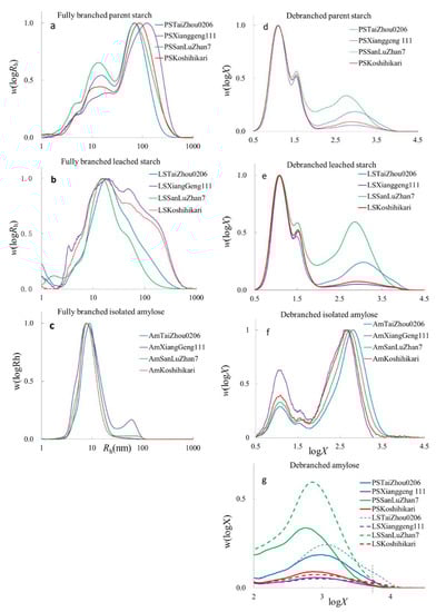 The SEC weight distributions w(logRh), being the weight distributions of molecules as a function of (logarithmic) size, which are the SEC hydrodynamic radii, Rh, of whole starch molecules, parent starch, leached starch, and isolated amylose, are shown in Figure 1. As is commonly seen, the fully branched distributions of parent starch show two peaks (Figure 1a), amylose (Rh < 30 nm) and amylopectin (Rh ≥ 30 nm). An additional peak at Rh~3–4 nm is thought to be residual proteins, probably because of the incomplete hydrolysis by protease during starch isolation [31]. Fully branched leached starches have amylose and amylopectin peaks, although they are not as distinct as those of parent starch (Figure 1b). All fully branched isolated amyloses have an amylose peak, while amylose from XiangGeng111 (AmXiangGeng111) has a wide range of molecular sizes with residual amylopectin peaks because the amylose separation procedure is not 100% effective (Figure 1c). Given that AmXiangGeng111 was isolated with butan-1-ol alone and the other three samples were isolated using isoamyl alcohol and butan-1-ol, it is seen that amylose enrichment using butanol alone can yield samples with increased amylose but not pure amylose. The use of isoamyl alcohol and butan-1-ol for amylose isolation was more efficient than butan-1-ol alone. In fully branched parent starch (PS) samples with lower amylose contents, PSXiangGeng111 and PSKsohihikari had higher R ¯ h,Ap and R ¯ h,Whole starch, the last two quantities being average sizes. Samples with higher amylose contents, PSSanLuzZhan7 and PSTaiZhou0206, had small average sizes of amylopectin, R ¯ h,Ap, and of whole starch, R ¯ h,Wholestarch (Table S1). This was also found in the leached starch. Leached starches (LS) from cooked Koshihikari (LSKoshihikari) and XiangGeng111 (LSXiangGeng111) rice contained more amylopectin than those of Taizhou0206 (LSTaizhou0206) and SanLuZhan7 (LSSanLuZhan7) (Figure 1a,b). As expected, the values of R ¯ h,Whole starch of the leached starches were smaller than those of parent starch, as seen elsewhere [28]. The R ¯ h,Am of leached starch and isolated amylose from SanLuZhan7 and TaiZhou0206 were larger than those of the other two. The R ¯ h,Am of isolated amylose was smaller than those of the parent and leached starches. It is speculated that not all of the amylose was extracted using the above method.