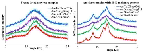 Figure 2. X-ray diffraction patterns for freeze dried amylose samples (left figure) and amylose samples with 10% moisture content (right figure).