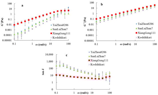 Dynamic rheology was used to help make inferences about the intra- and inter-chain entanglement and inter-chain overlap of amylose suspensions. The dynamical viscoelastic properties of amylose were measured using an oscillatory frequency sweep. G′ represents the elasticity of the sample, G″ the viscosity of the sample, and tan δ reflects the solid-like or liquid-like properties of the sample [41]. As shown in Figure 3, the values of storage and loss moduli of all samples increased with the oscillatory frequency, ω. An increase in G′ with ω was commonly observed in amylose suspensions [49,50]. The value of tan δ decreased in the low frequency range (0.1–25 rad/s), increased at high frequencies (25–100 rad/s), and was always >1, indicating predominantly viscous behavior rather than elastic; the amylose suspensions had a typically viscous fluid behavior [50]. The mechanical spectra of G′, G″ and tan δ were similar in AmTaizhou0206, AmSanLuZhan7, and AmKoshihikari; that of AmXiangGeng111 was noticeably different from amylose suspensions AmTaizhou0206, AmSanLuZhan7, and AmKoshihikari, probably because of amylopectin contamination. This agrees with reports that the G′ and G″ values of waxy rice starch are higher than those of non-waxy rice starch [49].
