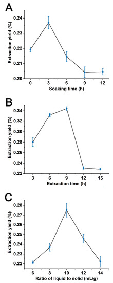 The effect of soaking time on extraction yield was studied at 0, 3, 6, 9 and 12 h. In Figure 2A, the extraction yield rose from 0 h to 3 h, reached maximum (0.237%) at 3 h and then significantly decreased. Thus, 0, 3 and 6 h were chosen and served as the three levels of soaking time for BBD.