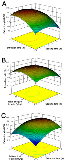 The results after analysis of variance (ANOVA) are shown in Table 3. Equation (5) was extremely significant (p < 0.0001) and the model was ideal (F = 29.86). The lack of fit was not significant (p = 0.4349). Correlation coefficient (R-Squared) was found to be 97.46%, indicating low experimental error. Adjusted correlation coefficient (Adj R-Squared) was 94.20%, indicating that the model was able to account for 94.20% of the variation in the response. In addition, the linear term (X2) was extremely significant (p < 0.01) and the linear terms (X1, X3) showed significant effects (p < 0.05). The quadratic terms (X12, X22 and X32) were extremely significant (p < 0.01), but the interaction terms (X1X2, X1X3 and X2X3) had no significant influence on the extraction yield. The order of impact of each factor was extraction time, followed by ratio of liquid to solid, and then soaking time.