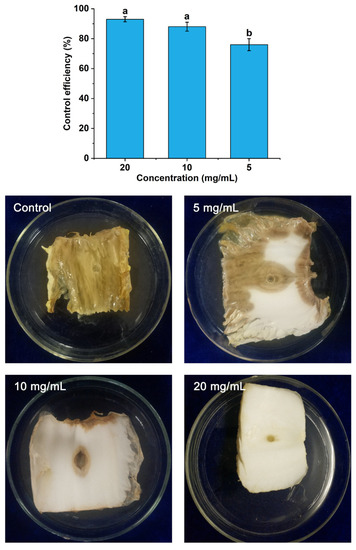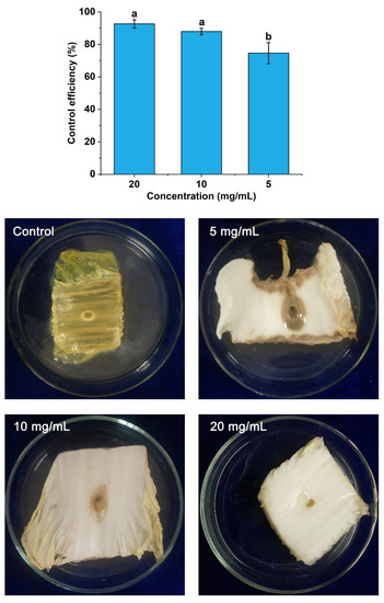 In the protective and curative activity assays, the degree of rot was measured according to the method reported by Li et al. [22] with some modifications. In this study, the size of the rotten area was used to represent the degree of rot and was measured using a ruler. In comparison to the control, a series of POEO concentrations significantly reduced the rot caused by Pcc. As seen in Figure 4, the whole Chinese cabbage stem was completely rotten in the control and the areas of rot were significantly greater than the three experimental groups (5 mg/mL, 10 mg/mL and 20 mg/mL). With the increase of concentrations of POEO, the area of rot was markedly reduced. In the 20 mg/mL group especially, the Chinese cabbage stems were scarcely decayed. The control efficiency of protective activity in the 5 mg/mL group was 74.67%. Compared with the 5 mg/mL group, the control efficiency of protective activity increased to 88.00% and 92.67% after treatment with POEO at 10 mg/mL and 20 mg/mL.