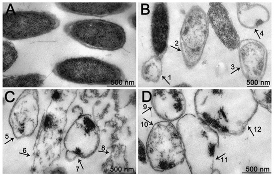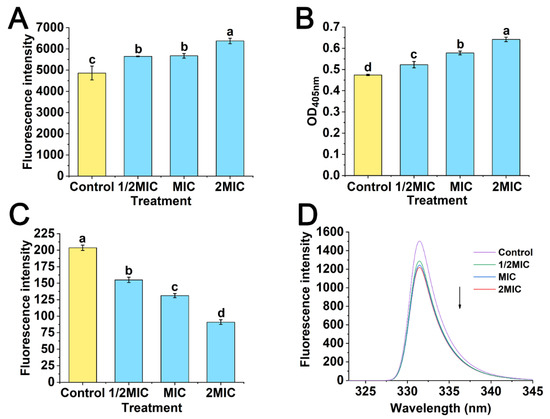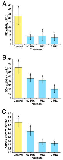 In comparison to the control, the ATPase activities in three experimental groups (1/2MIC, MIC and 2MIC) significantly declined (p < 0.05) (Figure 10C). Treated with MIC and 2MIC, the ATPase activities were significantly lower (p < 0.05) than the 1/2MIC group. The results for the MIC and 2MIC groups showed no significant differences.