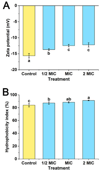 Surface charge and hydrophobicity were used to determine the surface characteristics. Zeta potential reflects the stability of colloidal dispersion [57]; surface charge of bacteria was estimated by zeta potential [58]. As seen in Figure 7A, the zeta potential increased, thereby causing the cell surface to become unstable [59]. As previously reported, the adhesive ability was associated with hydrophobicity [60]. After exposure to different concentrations of POEO, the hydrophobicity indices were significantly increased (Figure 7B), indicating an increase in the adhesive ability of Pcc. Pcc cells were therefore more likely to agglutinate, thereby leading to their death.