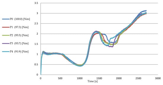 The rheological behavior analysis of the Mixolab procedure parameters were the following: tank temperature 30 °C, mixing speed 80 rpm, heating rate 2 °C/min, and total analysis time 45 min. Mixolab curves recorded are basically characterized by torque in five defined points (C1-C5; N·m), with temperatures and processing times corresponding to them.