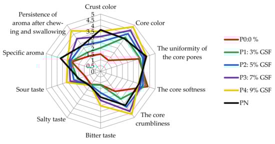 From the sensorial point of view, samples P1 (3% GSF) and P2 (5% GSF) fall within the limits of the characteristics of the control samples P0 (wheat flour type 480, white bread) and PN (wheat flour type 1250, black bread) for 6 out of 10 criteria: specific aroma, salty taste, persistence of aroma after chewing and swallowing, core softness, crust color, and uniformity of the core pores. P3 sample (7% GSF) overlapped the limits of the control samples regarding the core color, core crumbliness, and sour and bitter taste.