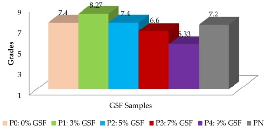 According to the results obtained and presented in Table 9, the following can be concluded: From the four samples (P1–P4) with the addition of GSF, samples P1 and P2 have a content of more than 3 g of fiber and may be referred to as a “source of fiber”. They are also accepted from the sensorial point of view and can be classified as commercial products. Sample P3, although it meets the condition of 3 g/100 g and can be attributed the nutritional term “source of fiber,” from a sensorial point of view falls into the category of products with potential medical purpose.