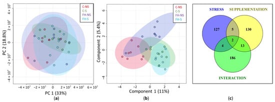 Evaluation of quantified hippocampal proteins (n = 4149). (a) Graphic representation defined by the first two principal components (PC1 and 2) of the principal component analysis (PCA). (b) Graphic representation defined by the first two components (1 and 2) of the sparse partial least squares discriminant analysis (sPLS-DA). (c) Venn diagram representing the differential proteins (p < 0.05) for stress, supplementation, and interaction of Stress × Supplementation after two-way ANOVA analysis.