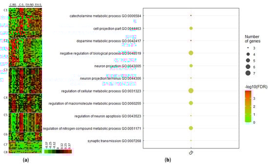 Proteins upregulated in cluster C5 corresponded to enrichment in pathways, such as dopamine metabolic processes (3/14, 21.4%, p = 1.0662 × 10−4), neuron projection (4/14, 28.5%, p = 4.4413 × 10−2), and the regulation of macromolecule metabolic processes (5/14, 35.7%, p = 4.8267 × 10−2) (Figure 3b, Supplementary Table S2). These pathways and the associated proteins are presented in Table 3.