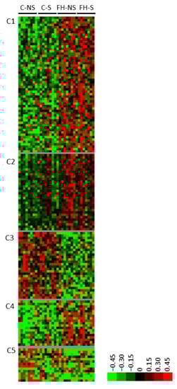 Proteins differentially expressed with acute mild stress (n = 138). (a) Unsupervised Bayesian clustering for the four groups (n = 8/group): control non-stressed (C-NS), control stressed (C-S), fish hydrolysate non-stressed (FH-NS), fish hydrolysate stressed (FH-S). (b) Gene ontology (GO) term enrichment for proteins upregulated with stress from cluster C5.