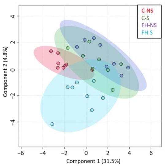 The sPLS-DA of differential proteins from the interaction supplementation × stress (n = 205) showed that the expression of proteins in stressed animals supplemented with fish hydrolysate was different from that of the other groups (Figure 5).