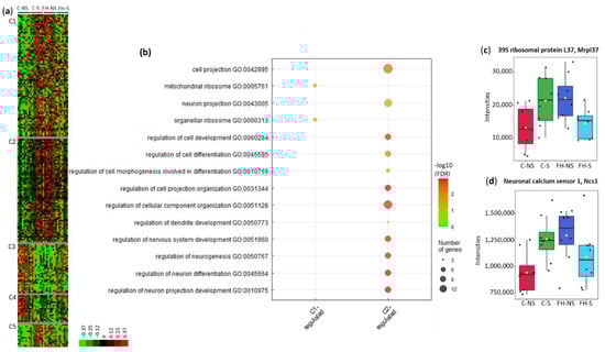 Gene ontology analysis of proteins in cluster C2 showed enrichment in biological pathways related to the neuronal network (e.g., regulation of neuron projection development (7/50, 14.0%, p = 1.2572 × 10−3) and regulation of cellular component organization (11/50, 22.0%, p = 1.3827 × 10−3) (Figure 6b, Supplementary Table S4). These pathways and associated proteins are presented in Table 5. The intensities of neuronal calcium sensor 1 within the four groups are displayed in Figure 6d.