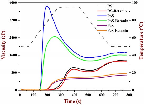 The pasting properties of different starches and starch–betanin samples were shown in Figure 1 and Table 1. RS and PoS exhibited typical pasting curves with significant convex and concave peaks. Upon heating, the starches swelled early and leached out amylose, which resulted in an increase in viscosity and displaying PV. The PV value of RS and PoS was 1032 and 3839 mPa·s, respectively. When constantly shearing at 95 °C, starch granules were disintegrated, and the BD value represented the degree of disintegration. The BD value of RS and PoS was 124 and 2353 mPa·s, respectively. Subsequently, cooling promoted the rearrangement of amylose molecules, and short-term retrogradation occurred. However, in the pasting patterns of PeS, the concave peak was extremely weak (Figure 1) and the TV value was close to that of the PV, accompanied by a very small BD value. Generally, pea starches were characterized by a high amylose content [22]. As reported by Han et al. [23,24], pasting properties of starches are related to their amylose content. The discrepancy of pasting patterns between RS, PoS and PeS may be affected by their amylose content, resources and other inherent characteristics of starch.