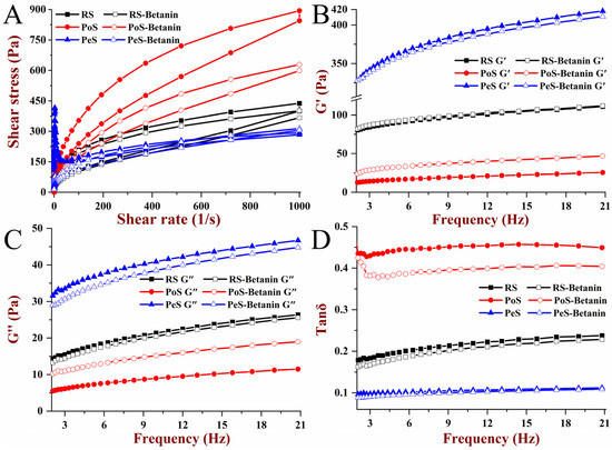 Shear rheology curves (A), storage moduli (G′) (B), loss moduli (G″) (C) and loss tangents (tanδ) (D) of starches and starch–betanin samples determined by rheological measurements. RS: rice starch; PoS: potato starch; PeS: pea starch.