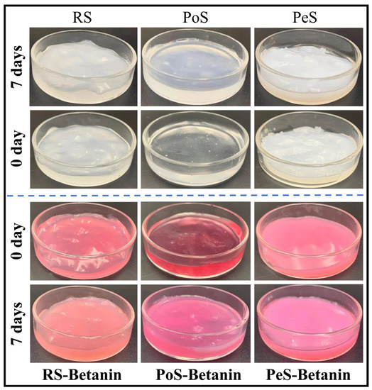 The appearance of starches and starch–betanin samples after retrogradation for 0 days and 7 days. RS: rice starch; PoS: potato starch; PeS: pea starch.