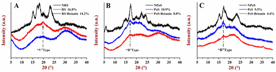 XRD diagrams of starches and starch–betanin samples after retrogradation; (A) rice starch, (B) potato starch, and (C) pea starch. NRS: native rice starch; NPoS: native potato starch; NPeS: native pea starch. RS: retrograded rice starch; PoS: retrograded potato starch; PeS: retrograded pea starch.